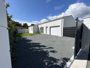 La maison est composée de 3 chambres, une salle d'eau, une pièce de vie avec cuisine ouverte, un cellier, un garage et un jardin.